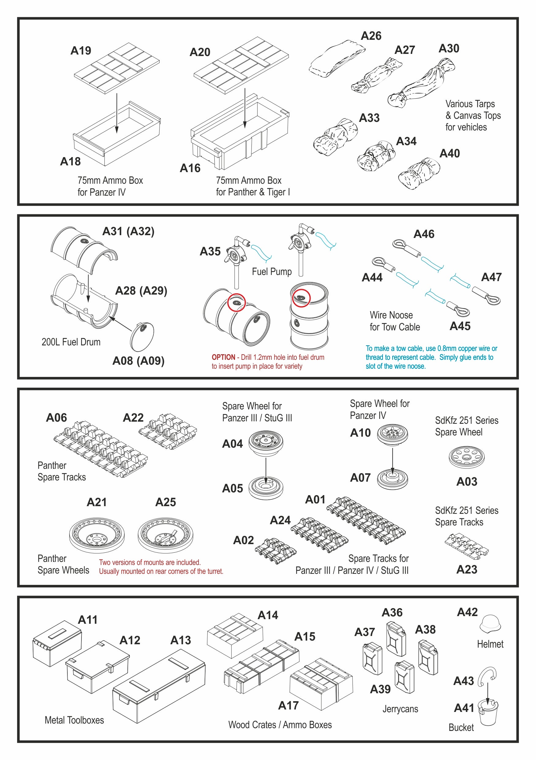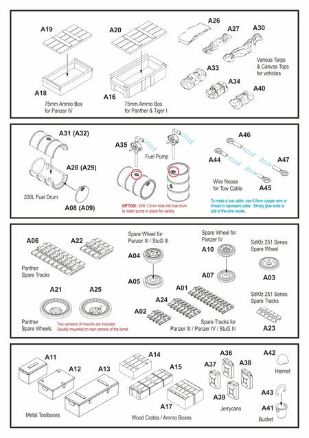 - Ersatzlaufräder und -ketten (Panzer III / StuG III / Panzer IV / Panther / SdKfz 251)
