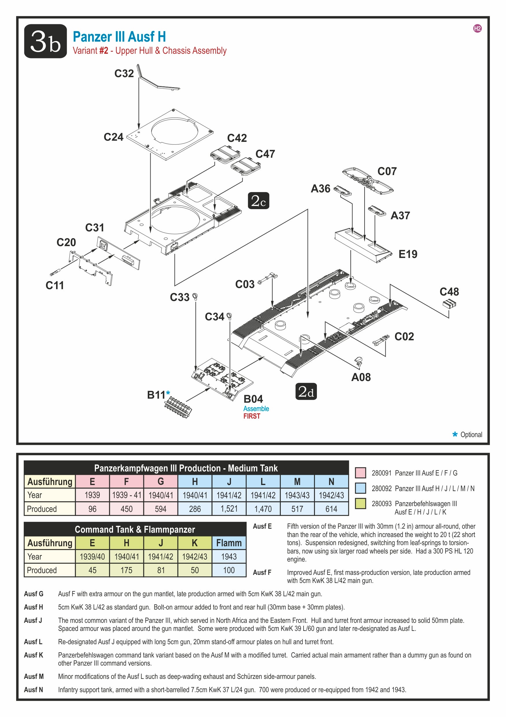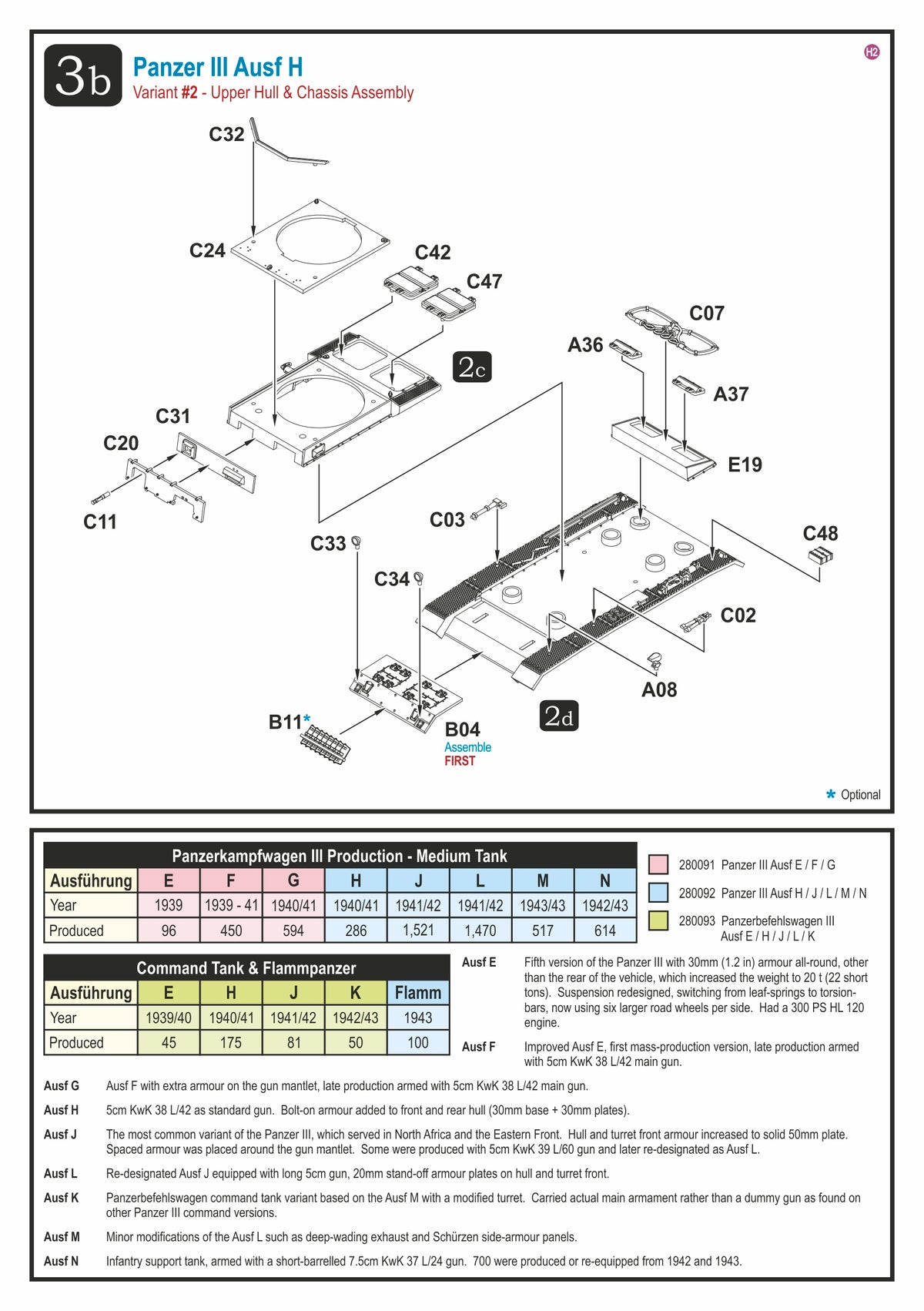 Der Panzerkampfwagen III ( SdKfz 141 ), allgemein bekannt als Panzer III , war ein mittlerer Panzer, der in den 1930er Jahren von Deutschland entwickelt und im Zweiten Weltkrieg ausgiebig eingesetzt wurde. Er sollte gegen andere Panzerfahrzeuge kämpfen und neben dem ähnlichen Panzer IV dienen und diesen unterstützen, der ursprünglich zur Infanterieunterstützung entwickelt worden war. Als die Deutschen jedoch den gewaltigen russischen T-34- Panzern gegenüberstanden, wurden stärkere Panzerabwehrkanonen benötigt, und da der Panzer IV mit einem größeren Turmkranz mehr Entwicklungspotenzial hatte, wurde er neu konstruiert, um das langläufige 7,5-cm-Geschütz KwK 40 tragen zu können. Der Panzer III tauschte effektiv die Rollen mit dem Panzer IV, da die letzte Version des Panzer III ab 1942 mit der 7,5-cm-KwK 37 L/24 ausgestattet war, die besser zur Infanterieunterstützung geeignet war. Die Produktion des Panzer III wurde 1943 eingestellt. Trotzdem diente das leistungsfähige Fahrgestell des Panzer III bis Kriegsende als Wanne für das Sturmgeschütz III . Zwischen 1939 und 1943 wurden insgesamt 5.774 Stück produziert. Dennoch diente das leistungsstarke Fahrgestell des Panzer III bis Kriegsende als Wanne für das Sturmgeschütz III . Zwischen 1939 und 1943 wurden insgesamt 5.774 Stück produziert.