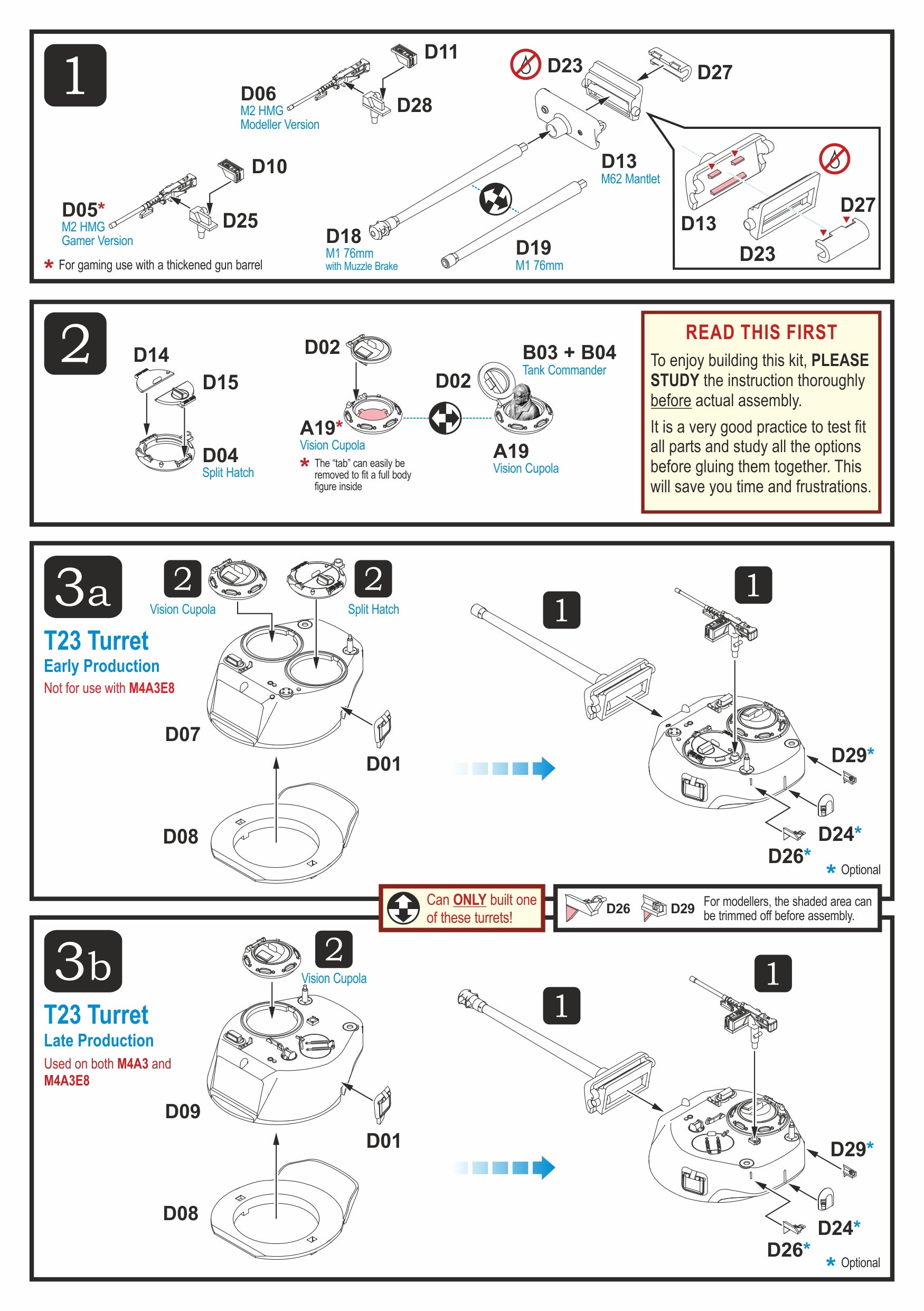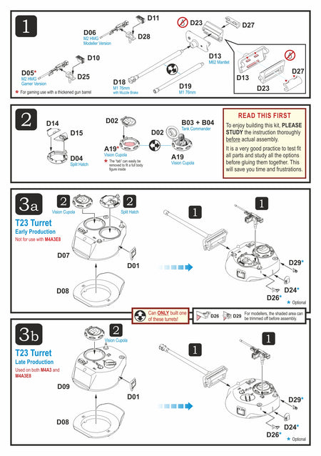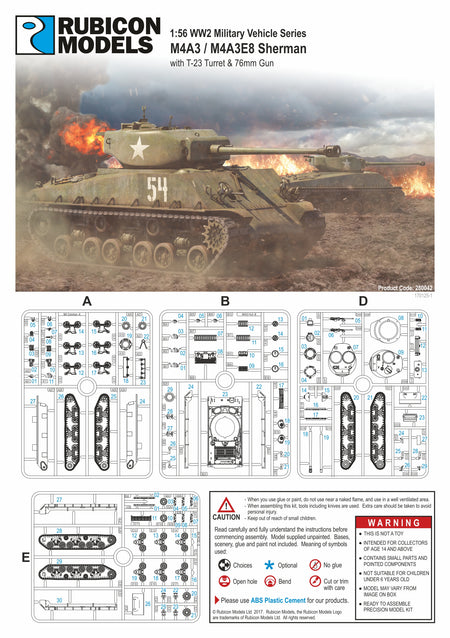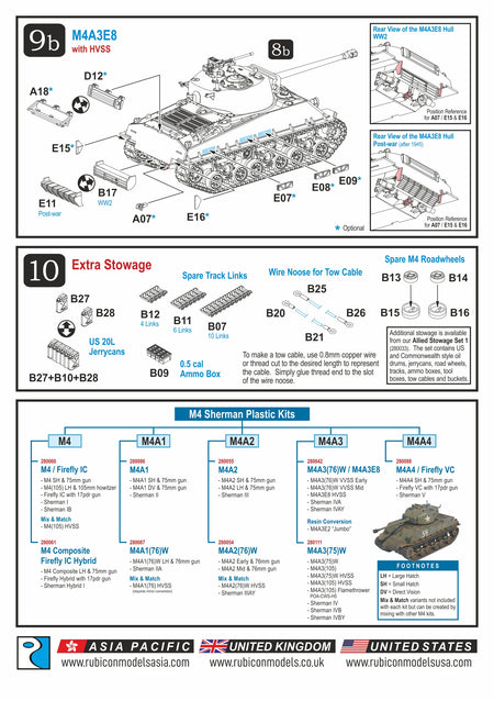 Dieses Kit enthält die Teile zum Bau einer frühen oder späten Version des M4A3 (76 mm) W oder eines M4A3E8 mit HVSS-Aufhängung. Es enthält außerdem einen optionalen Satz Ketten mit verlängerten Endverbindern. Die Luken für Rumpf und Kuppel sind separat, und eine Kommandantenfigur sowie Stauraum sind im Lieferumfang enthalten.