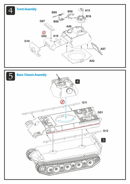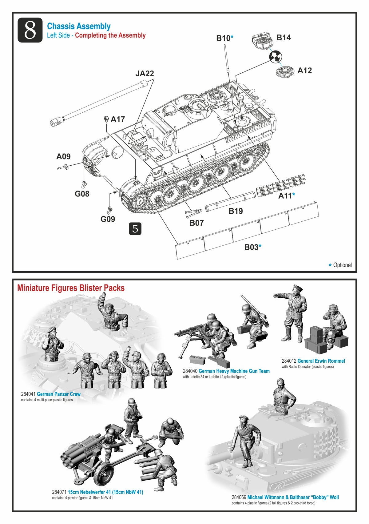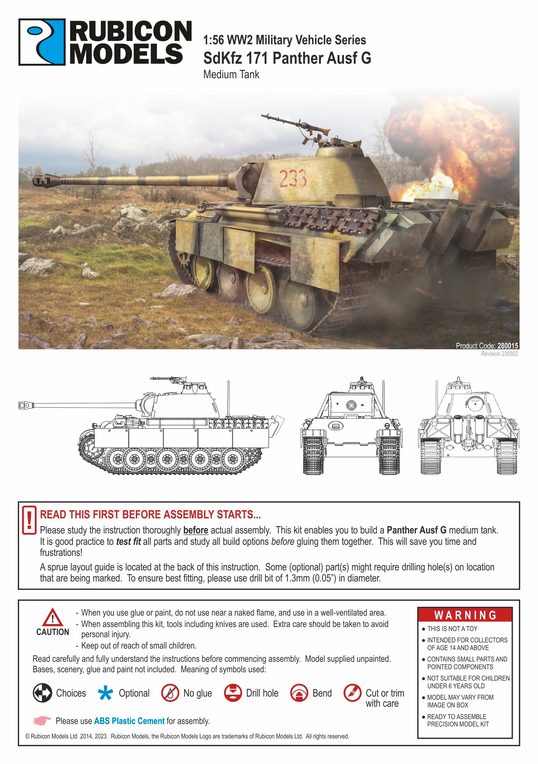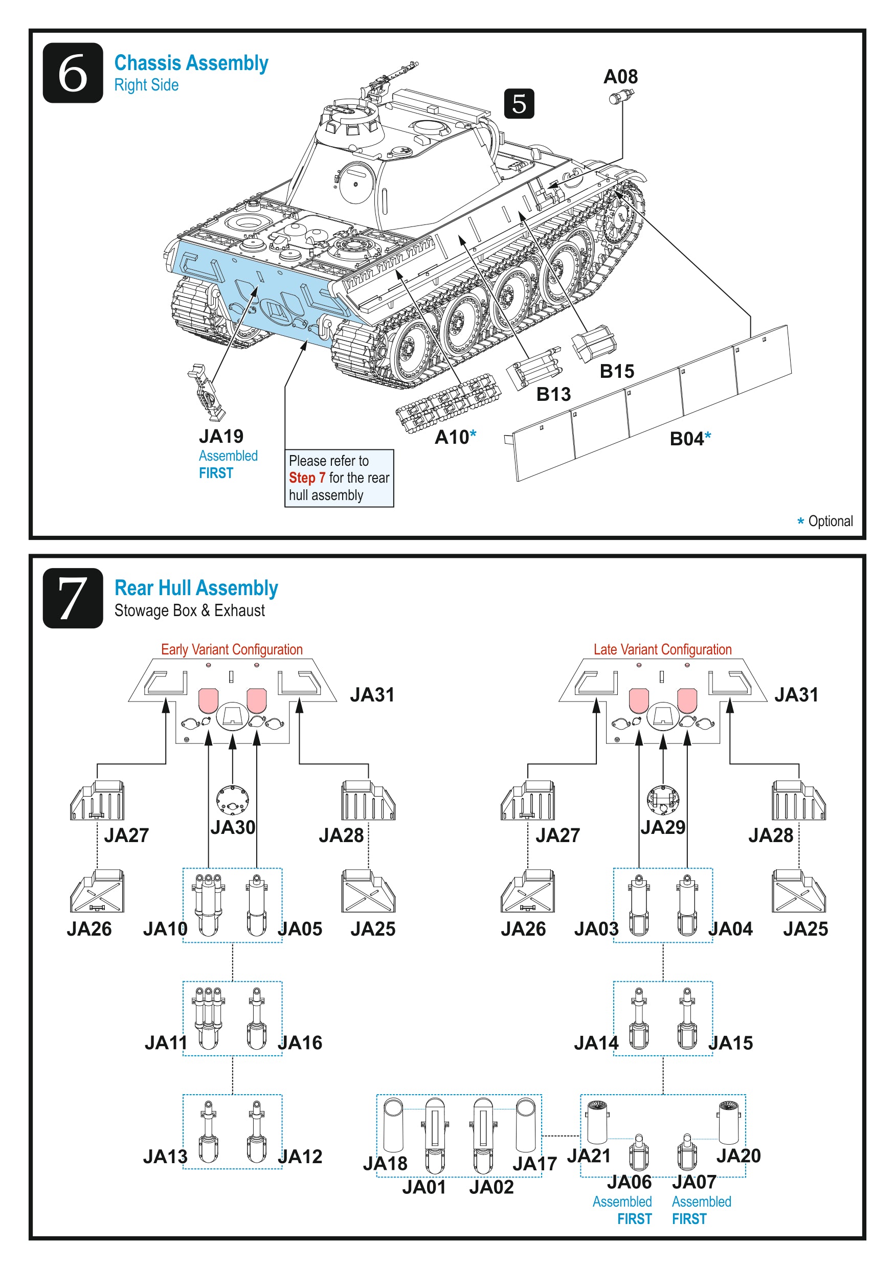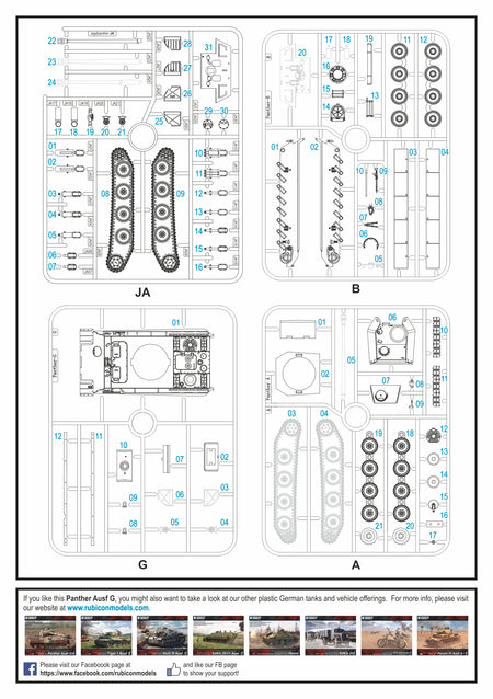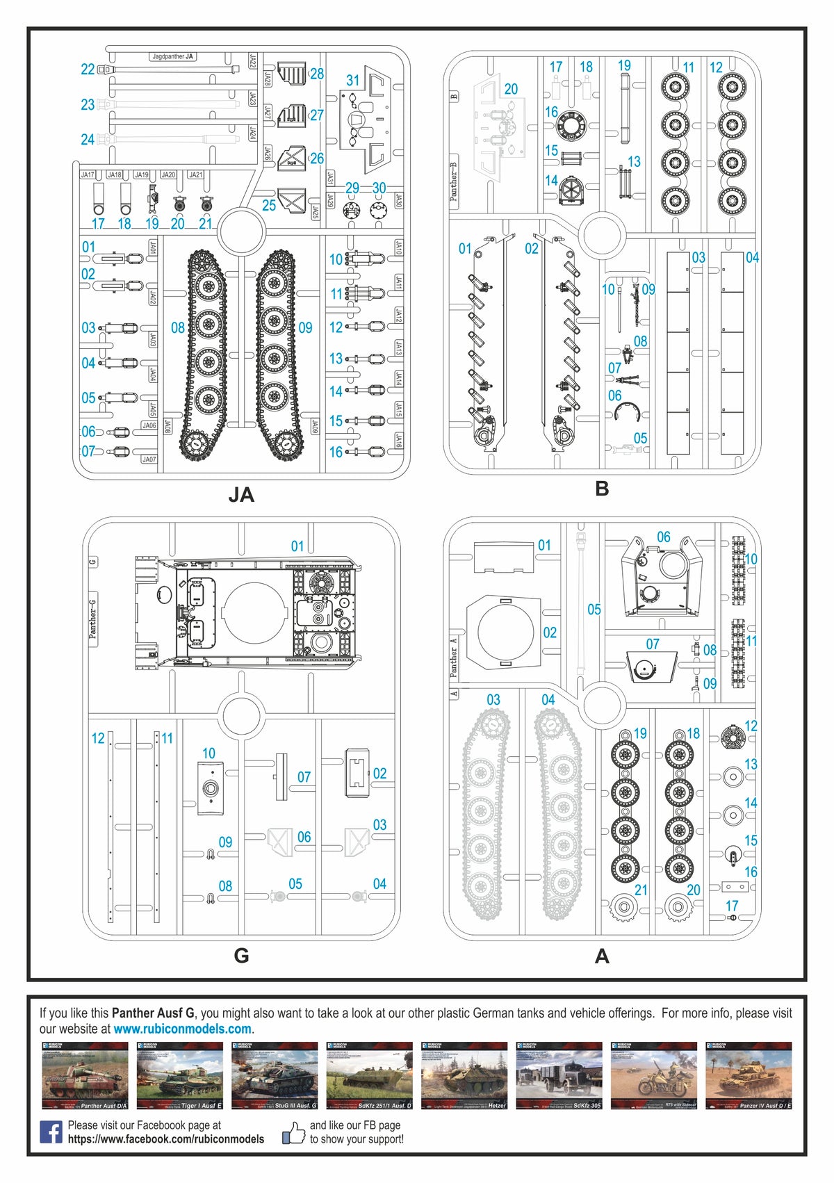 This model kit depicts the late version of the Panther tank. About 3,000 were produced between March 1944 and April 1945. With this kit, you can assemble a Panther Ausf G with optional air cooler and rear exhaust choices, with or without side armour.