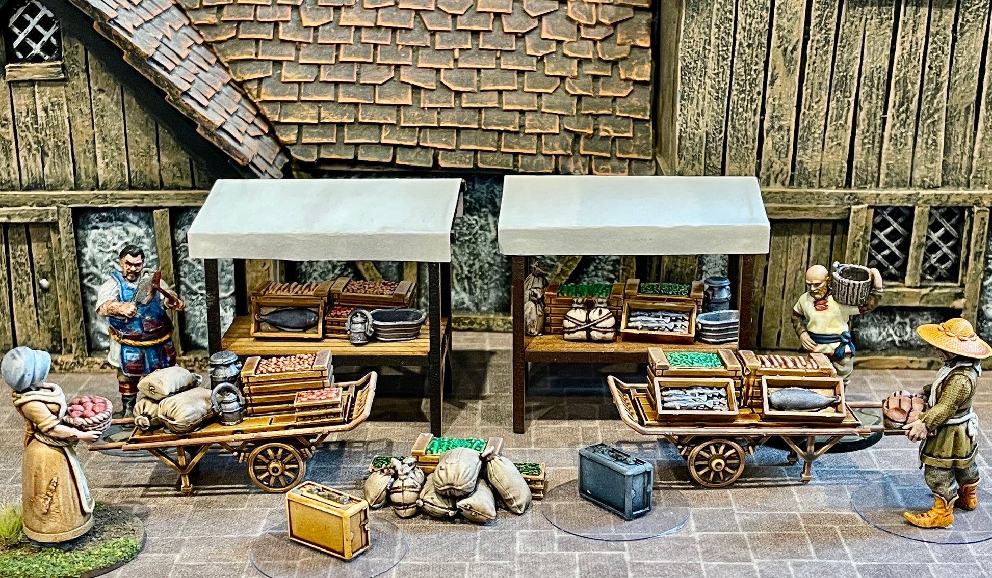 - Various crates holding fish and vegetables