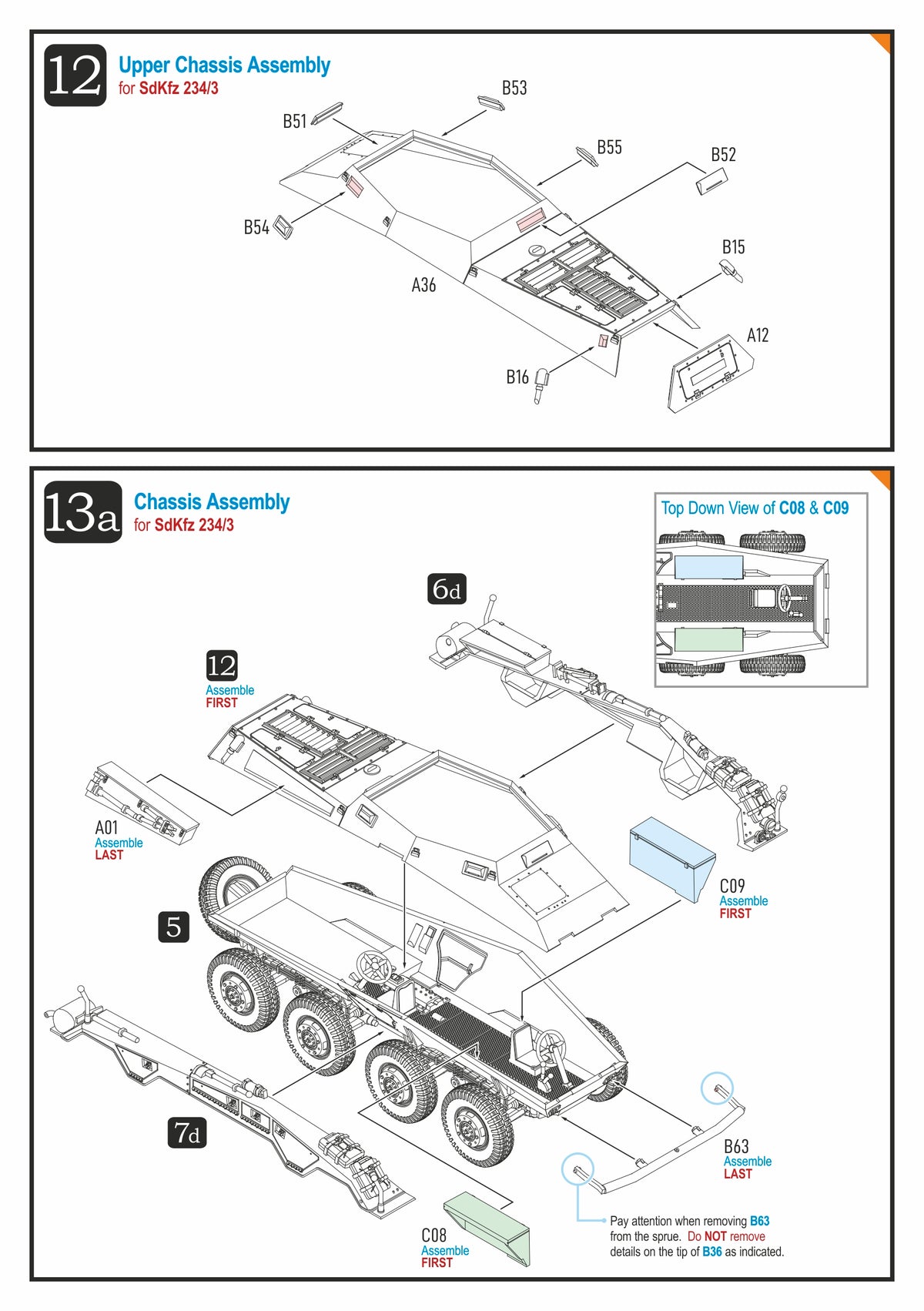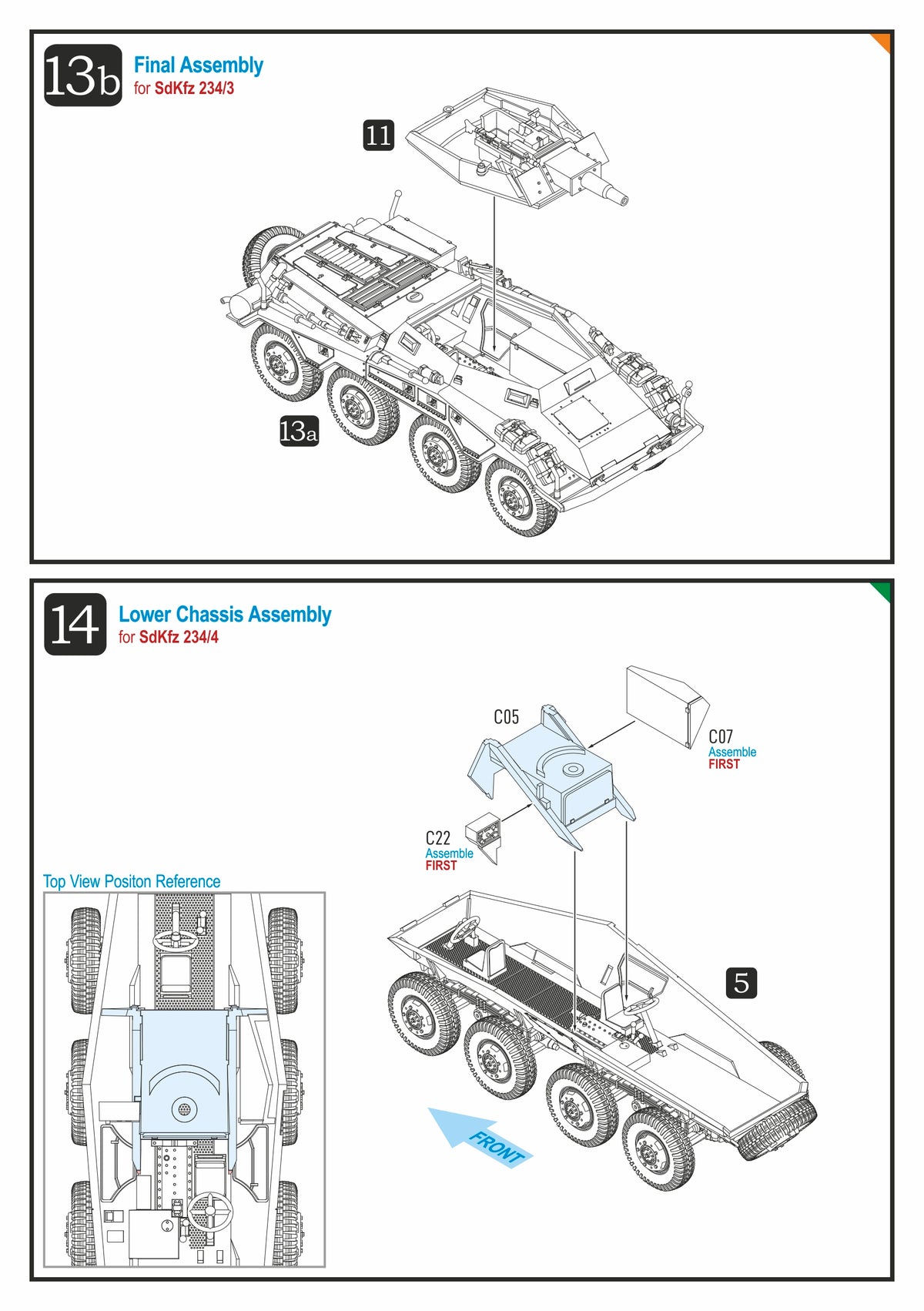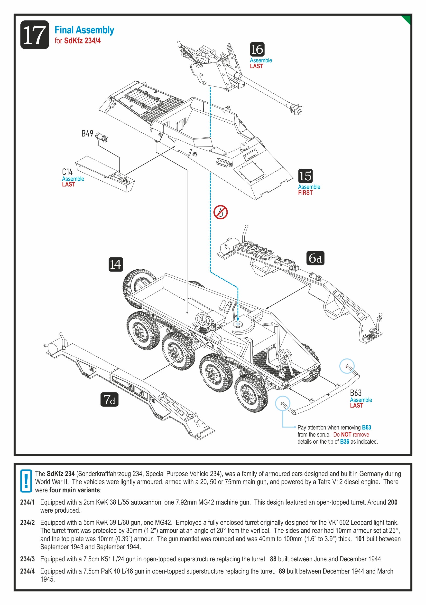 The SdKfz 234 (Sonderkraftfahrzeug 234, Special Purpose Vehicle 234), was a family of armoured cars designed and built in Germany during World War II. The vehicles were lightly armoured, armed with a 20, 50 or 75 mm main gun, and powered by a Tatra V12 diesel engine. The kit can be built as a SdKfz 234/2 with a 5cm KwK 39 L/60 gun, a SdKfz 234/3 with a 7.5cm K51 L/24 gun, or a SdKfz 234/4 with a 7.5cm PaK 40 L/46 gun. It also comes with a simplified chassis interior.