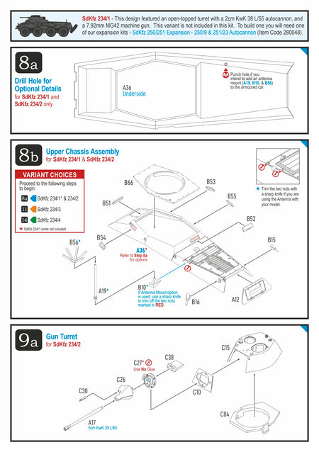 To build an SdKfz 234/1 with a 2cm KwK 38 L/55 autocannon will require the 280048 expansion kit, sold separately.