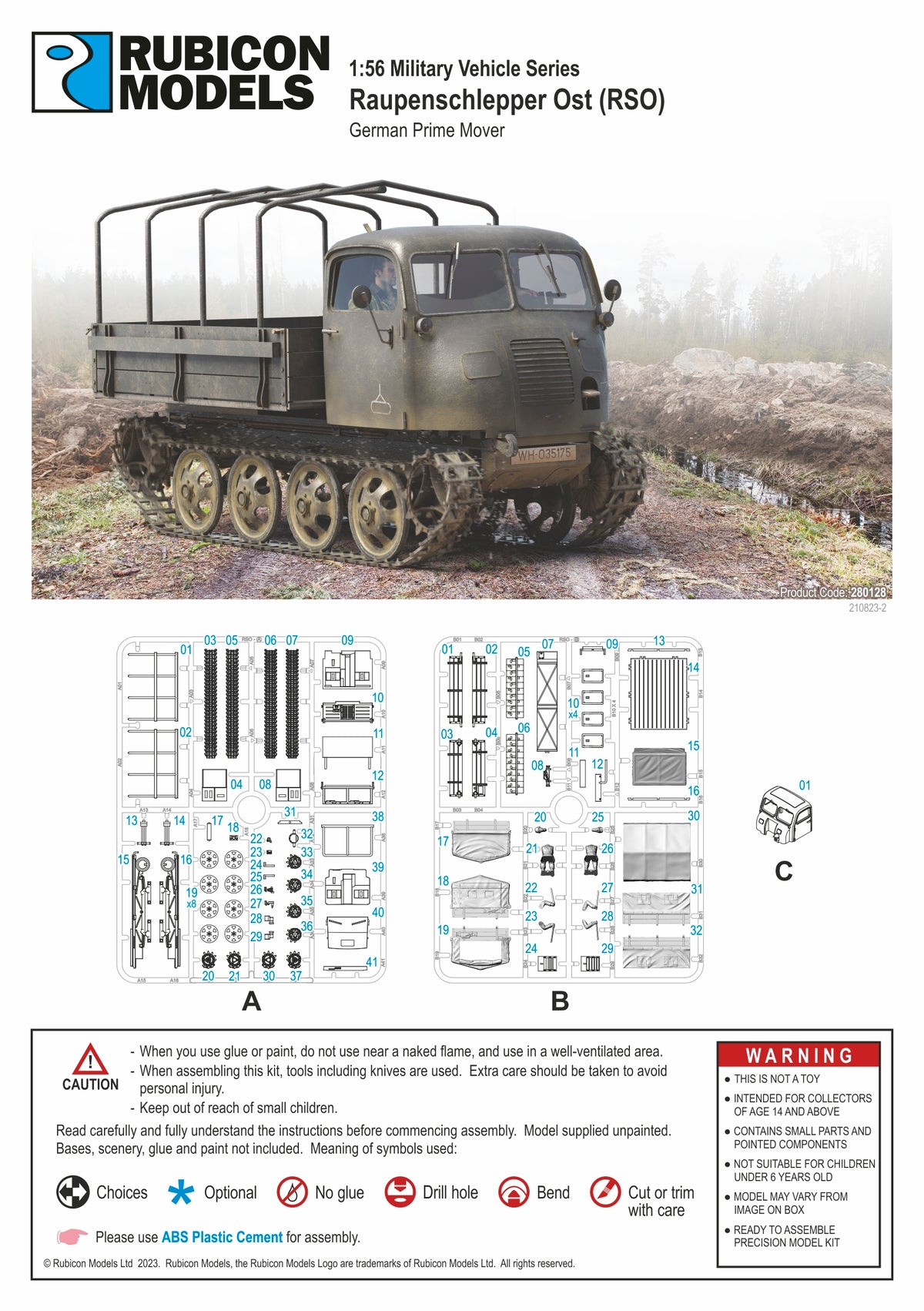 On the Eastern Front, the roadways were extremely primitive and with seasonal mud the Germans required a fully tracked supply vehicle to maintain mobility, hence the introduction of the Raupenschlepper Ost (RSO) - a fully tracked, lightweight vehicle by Steyr. The kit offers the RSO/01 or RSO/03 build choice, and comes with an optional canvas rack, tarpaulin top, snow/bog track extension pad, and driver.