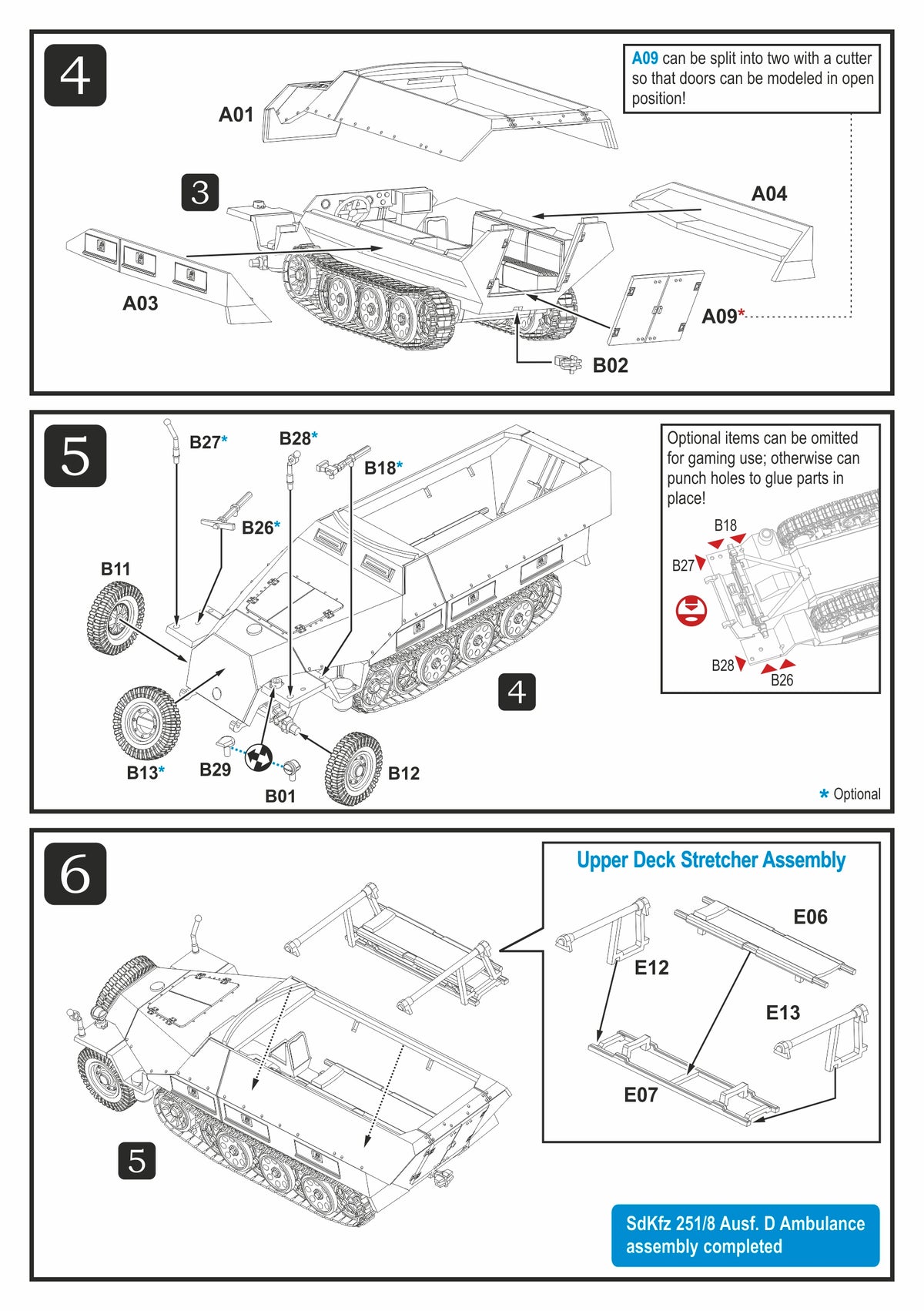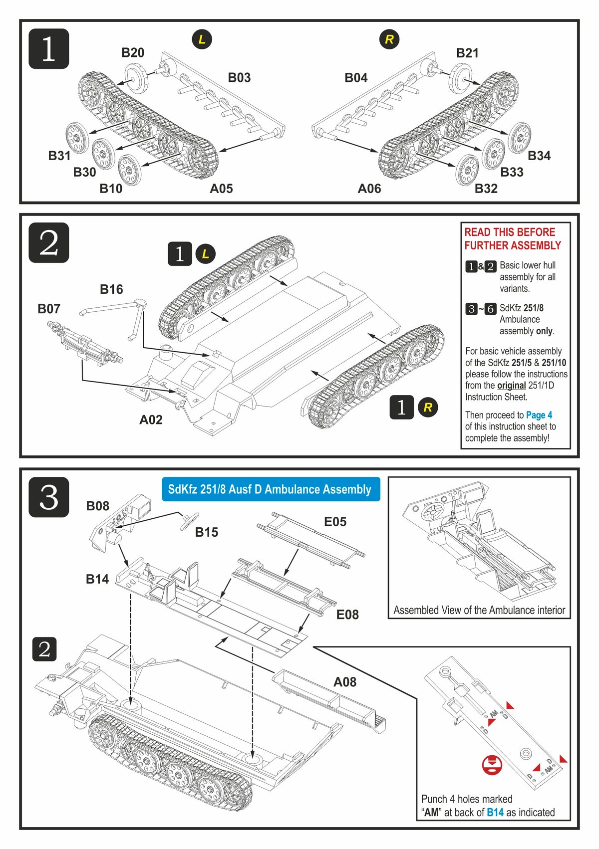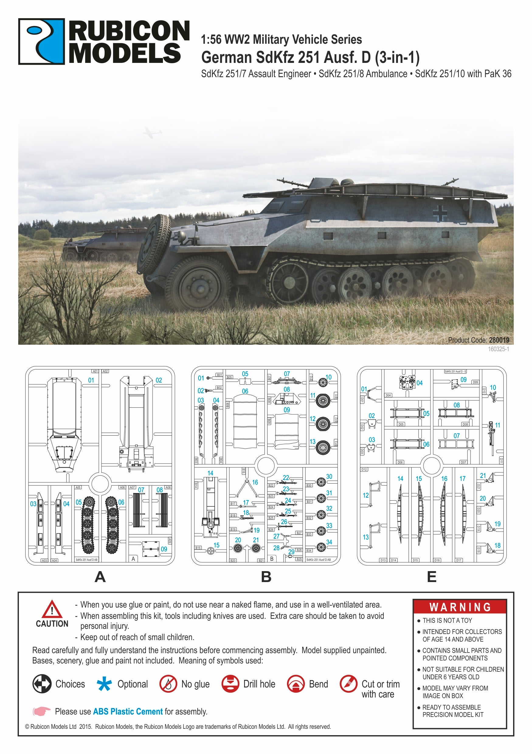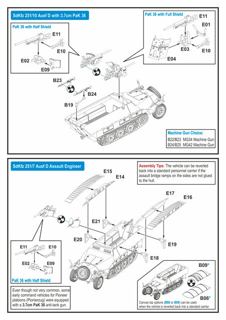 Ce SdKfz 251 Ausf D très détaillé est un kit plastique 3 en 1 . Le kit peut être construit pour représenter un SdKfz 251/7 (véhicule d'ingénierie d'assaut), un SdKfz 251/8 (ambulance) ou un SdKfz 251/10 (avec un canon antichar PaK 36 de 37 mm).