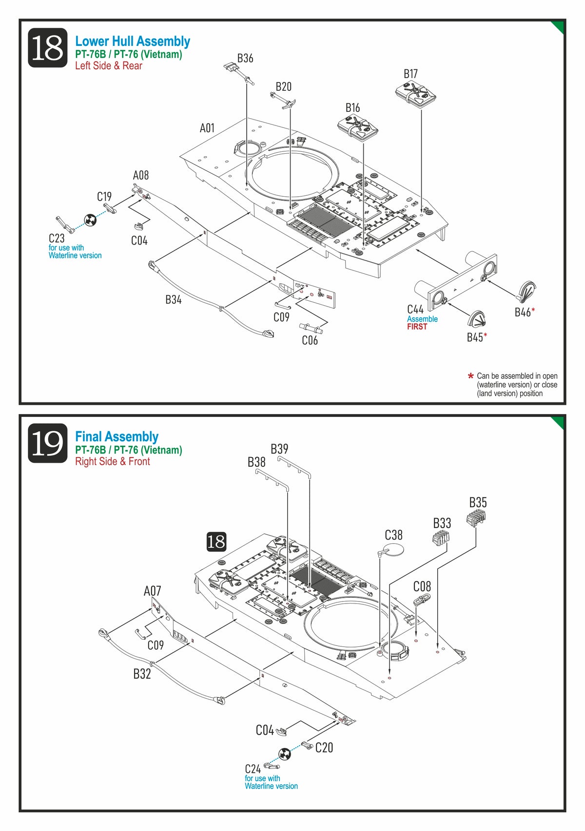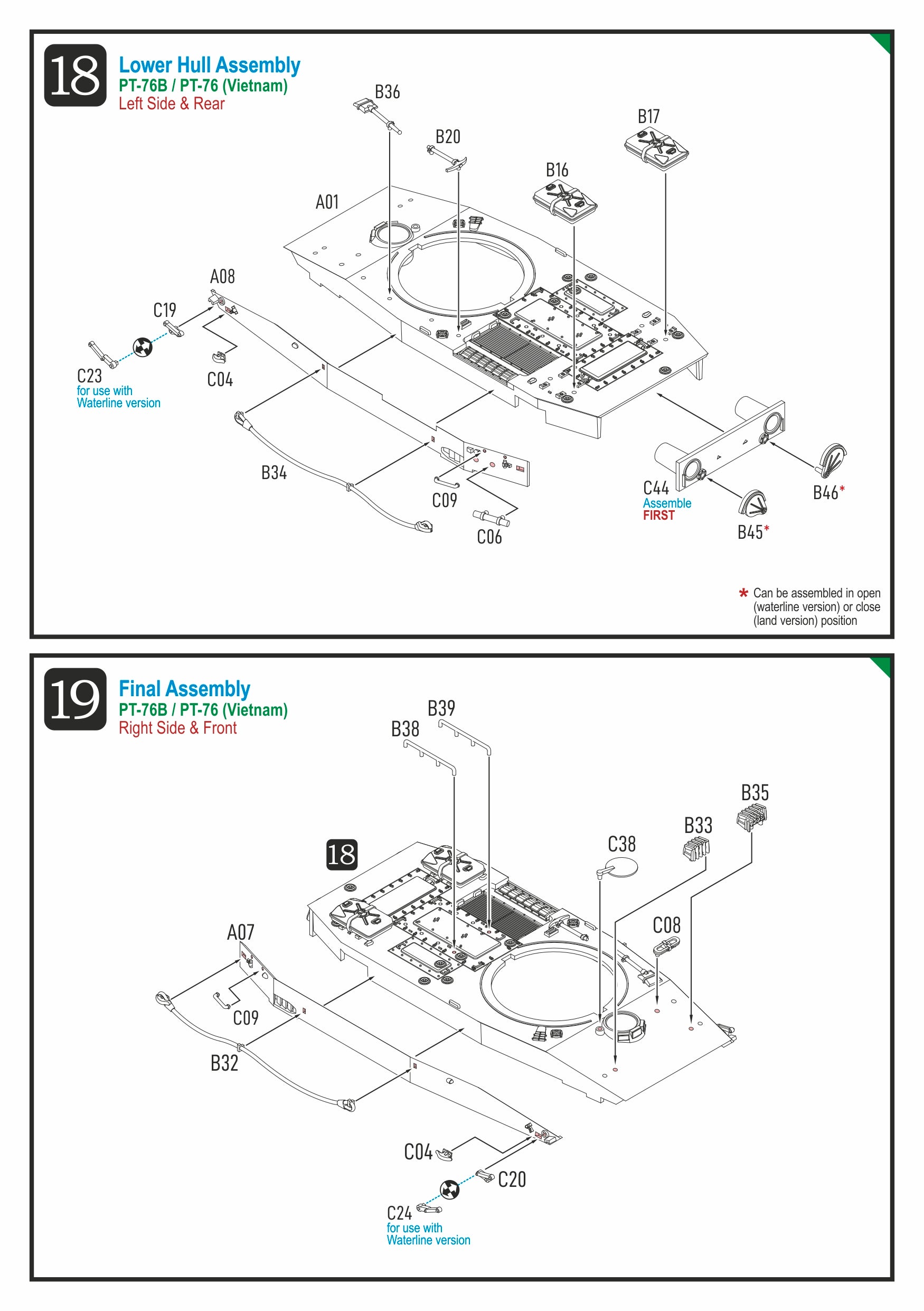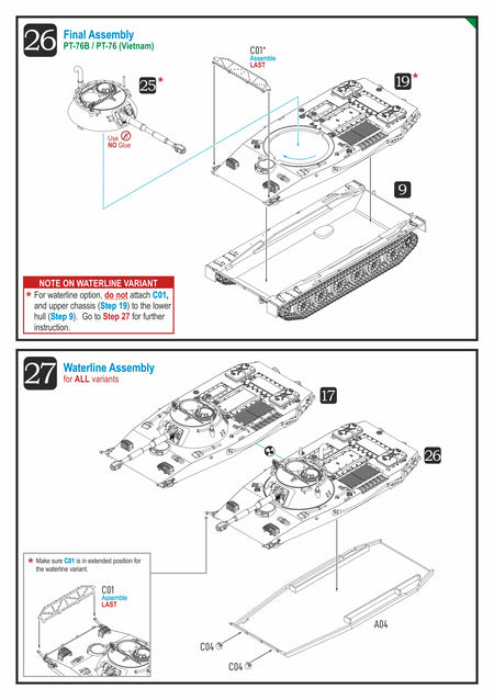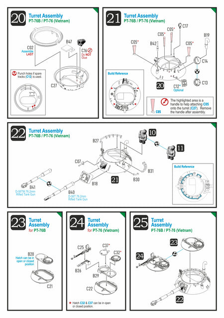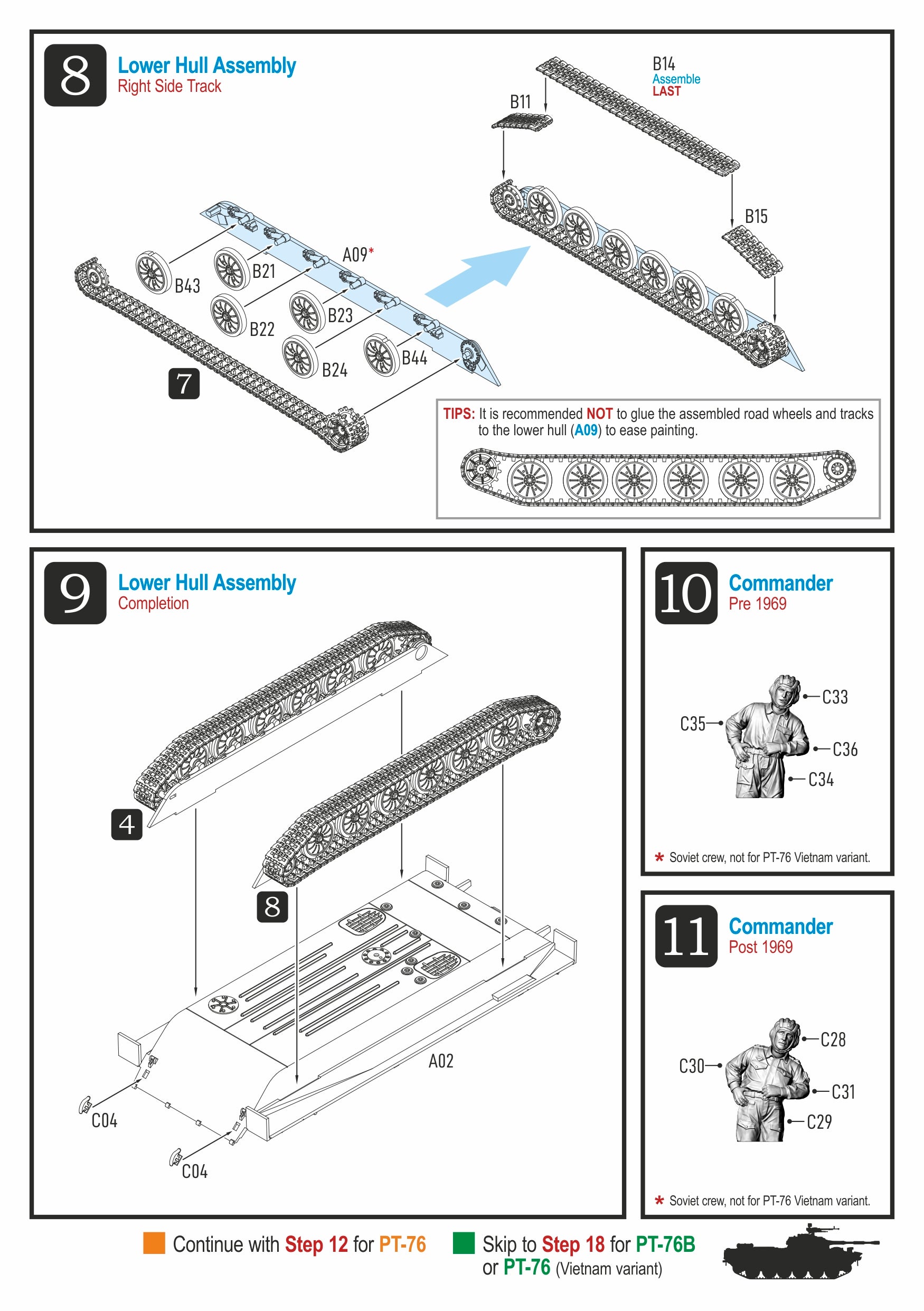Le PT-76 est un char léger amphibie soviétique introduit au début des années 1950 et qui est rapidement devenu le char de reconnaissance standard de l' armée soviétique et des autres forces armées du Pacte de Varsovie . Il était utilisé dans des rôles de reconnaissance et d'appui-feu et était largement exporté. Avec ce kit, vous pouvez construire le PT-76 ou le PT-76B , et il est livré avec un choix de frein de bouche et de planche de garniture, ainsi qu'un DShK 1938 HMG et un équipage en option.