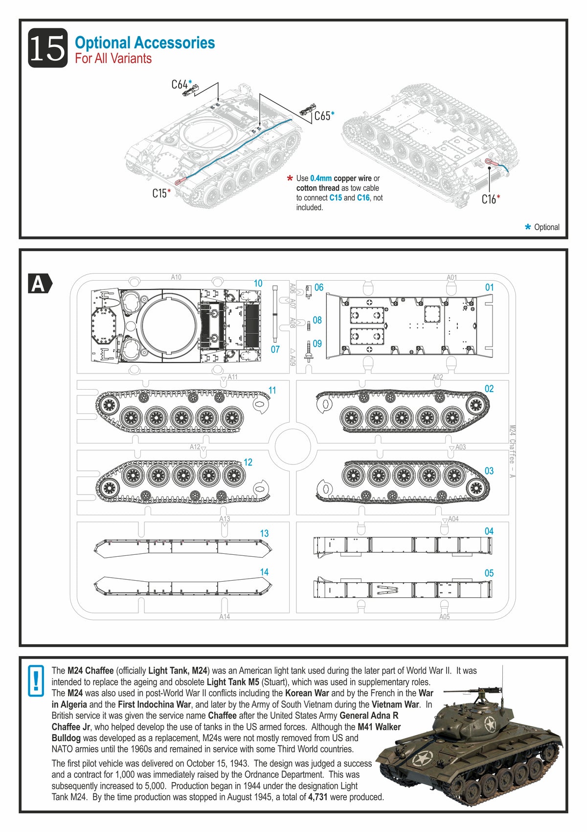 The M24 Chaffee (officially light tank M24) was an American light tank used during the later part of World War II it was also used in post–World War II conflicts including the Korean War, and by the French in the War in Algeria and the First Indochina War. In British service it was given the service name Chaffee after the United States General Adna R Chaffee Jnr, who helped develop the use of tanks in the United States Armed Forces Although the M41 Walker Bulldog was developed as a replacement, M24s were not mostly removed from U.S. and NATO armies until the 1960s and remained in service with some Third World countries.
