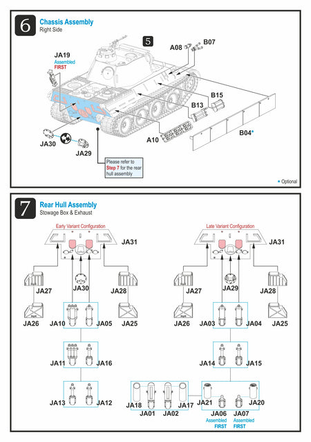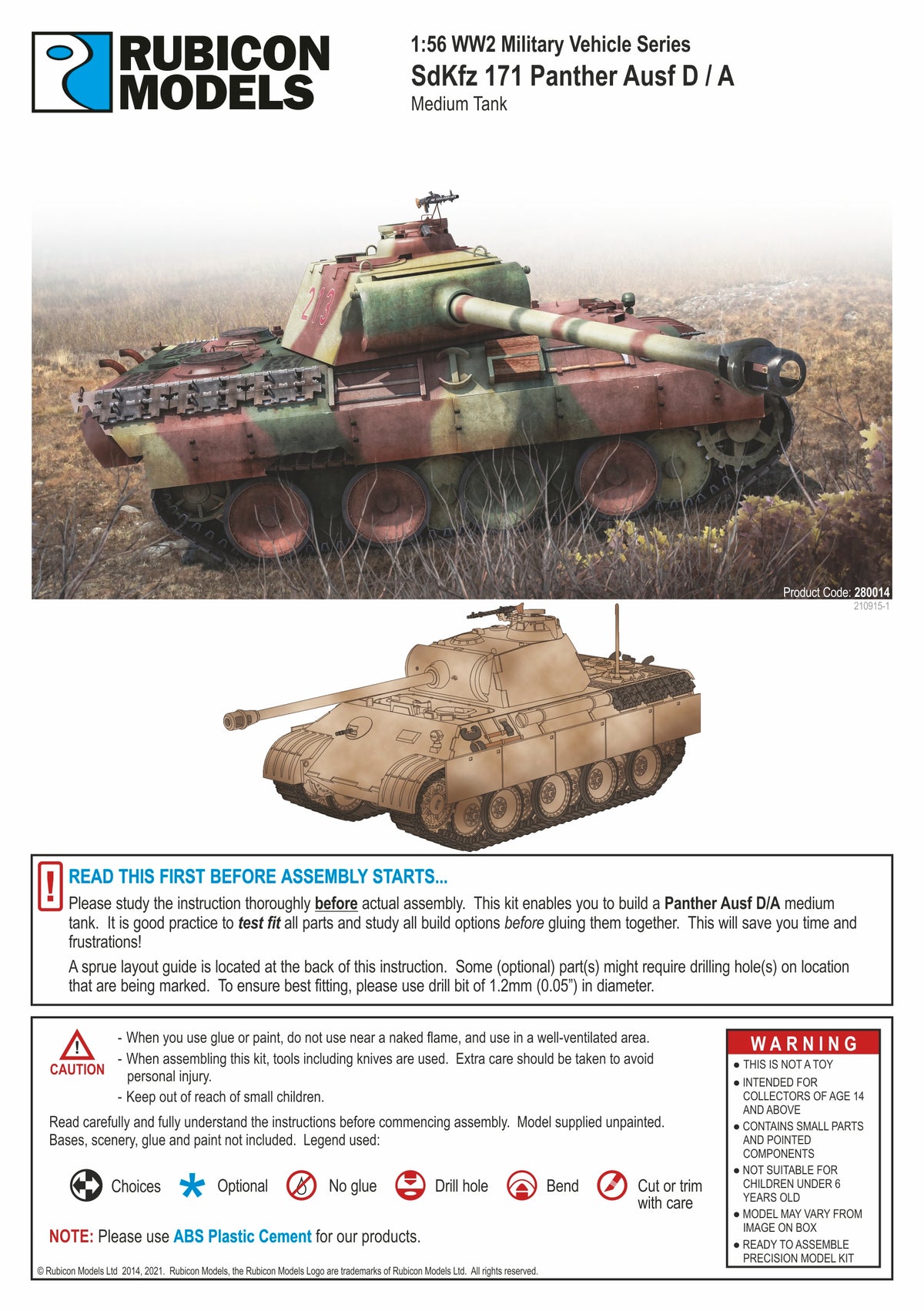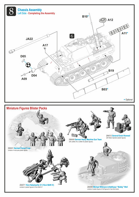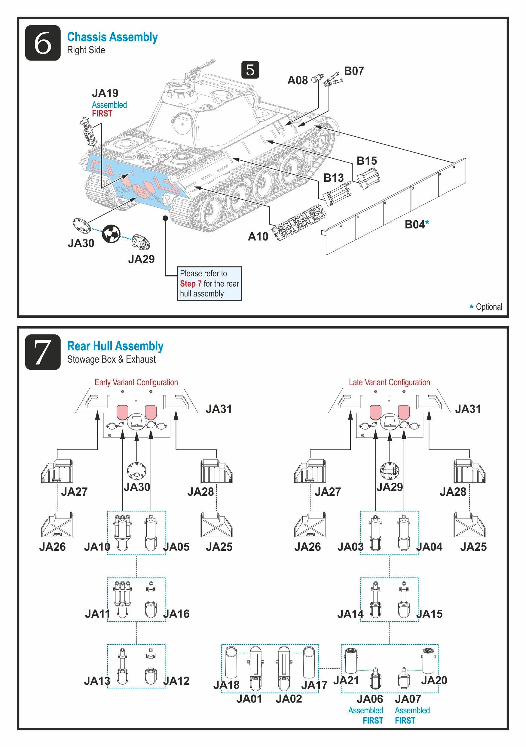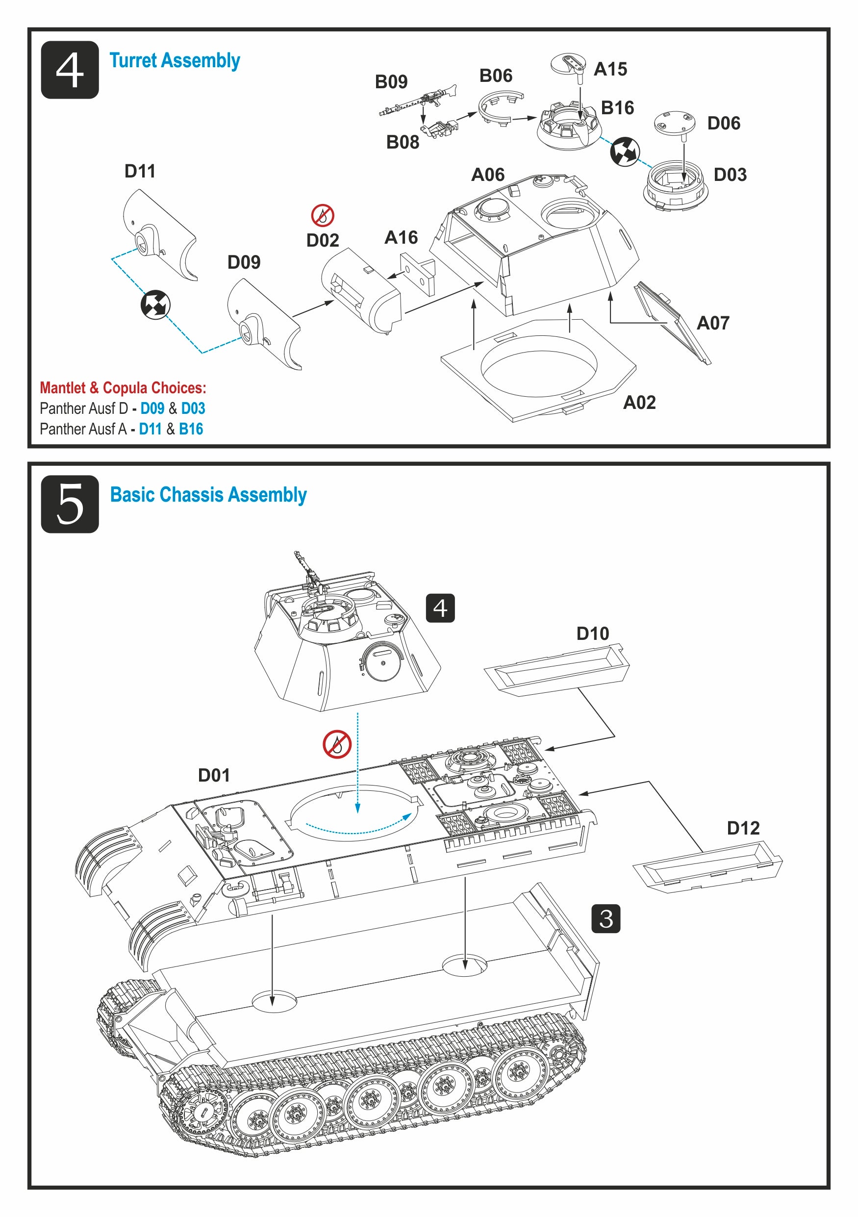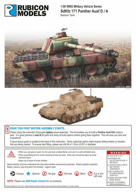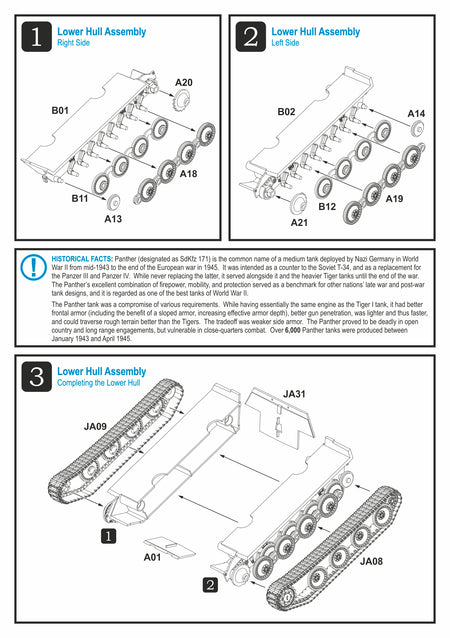 This model kit depicts two early versions of the Panther tank. About 3,000 were produced between January 1943 and June 1944. With this kit, you can assemble the Panther to become either an Ausf D or Ausf A variant with 2 copula choices, and with or without side armour.