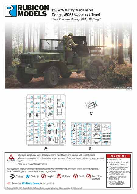 The WC55 Truck, 3/4 ton, 4x4 Gun Motor Carriage Dodge (G502) was a modified WC52 designed to carry an M3A1 37mm anti-tank gun and shield mounted on its cargo bed; the WC55 and gun combination was designated M6 Fargo Gun Motor Carriage (GMC) with 37mm Anti-tank Gun (G121) with a payload of 80 round of 37mm ammunitions. 5,380 built, most of them later dismantled and returned to service as WC52 cargo trucks.