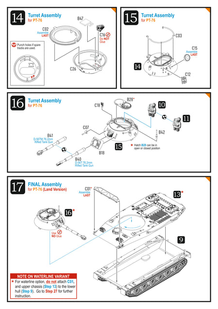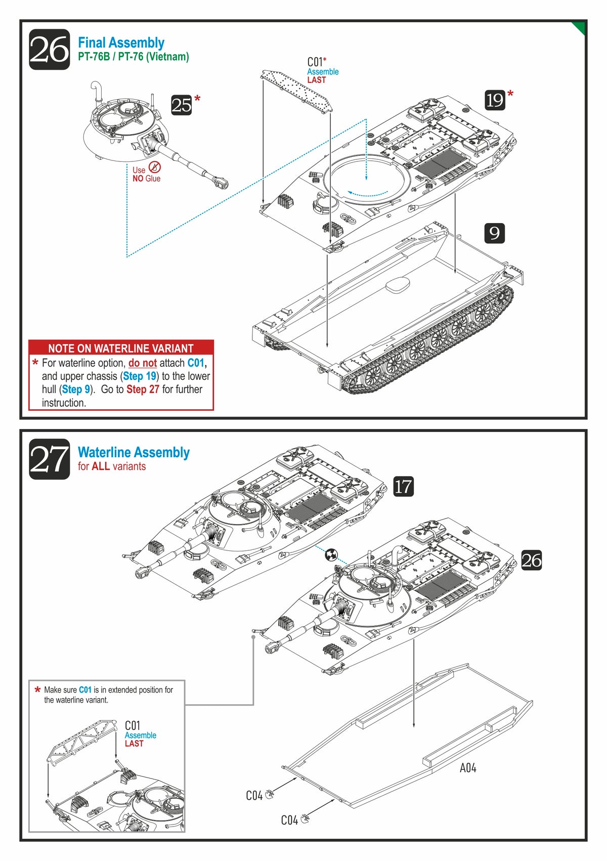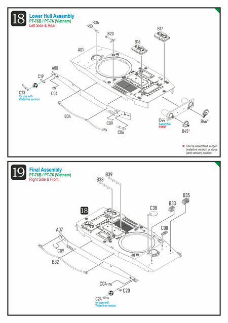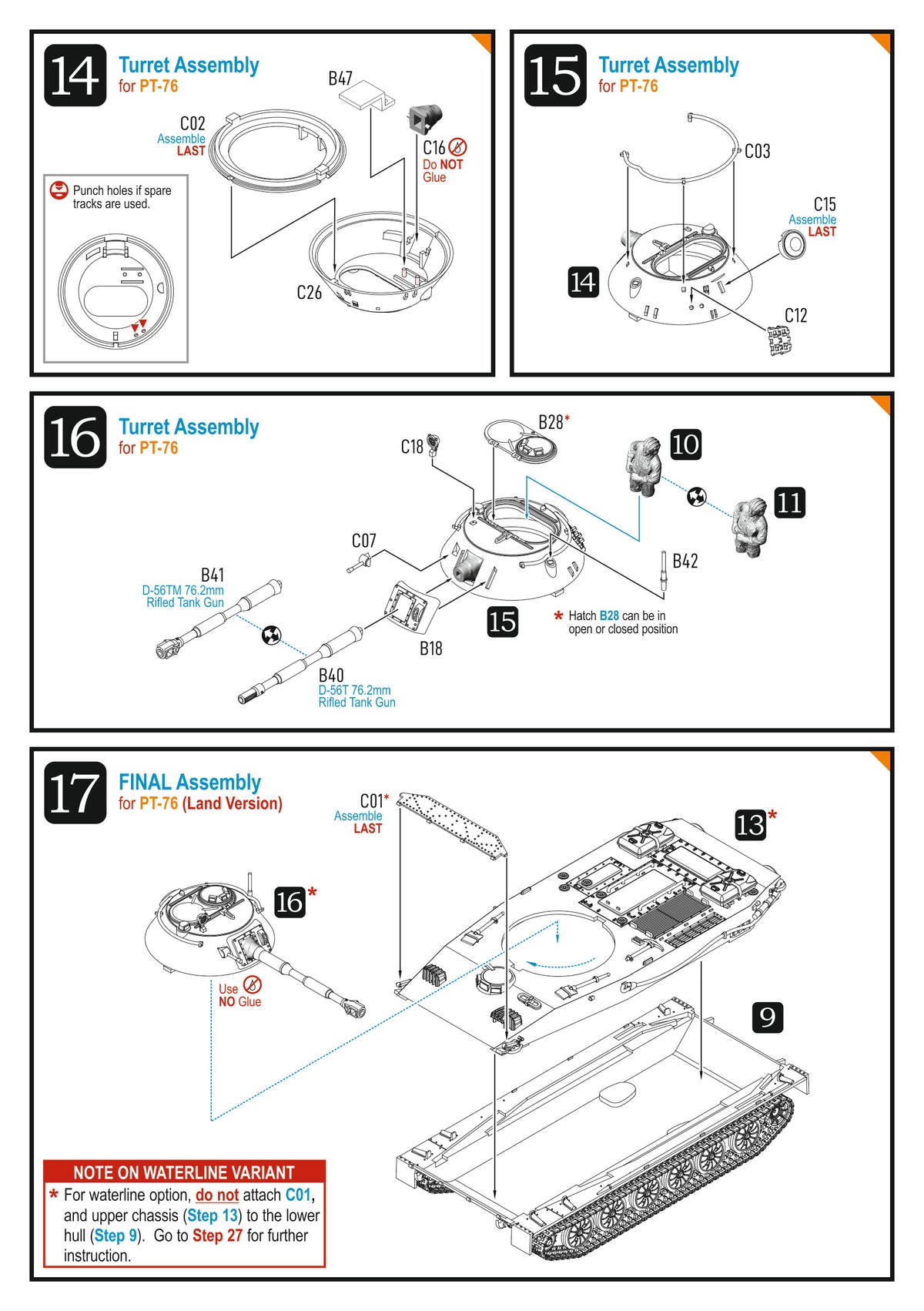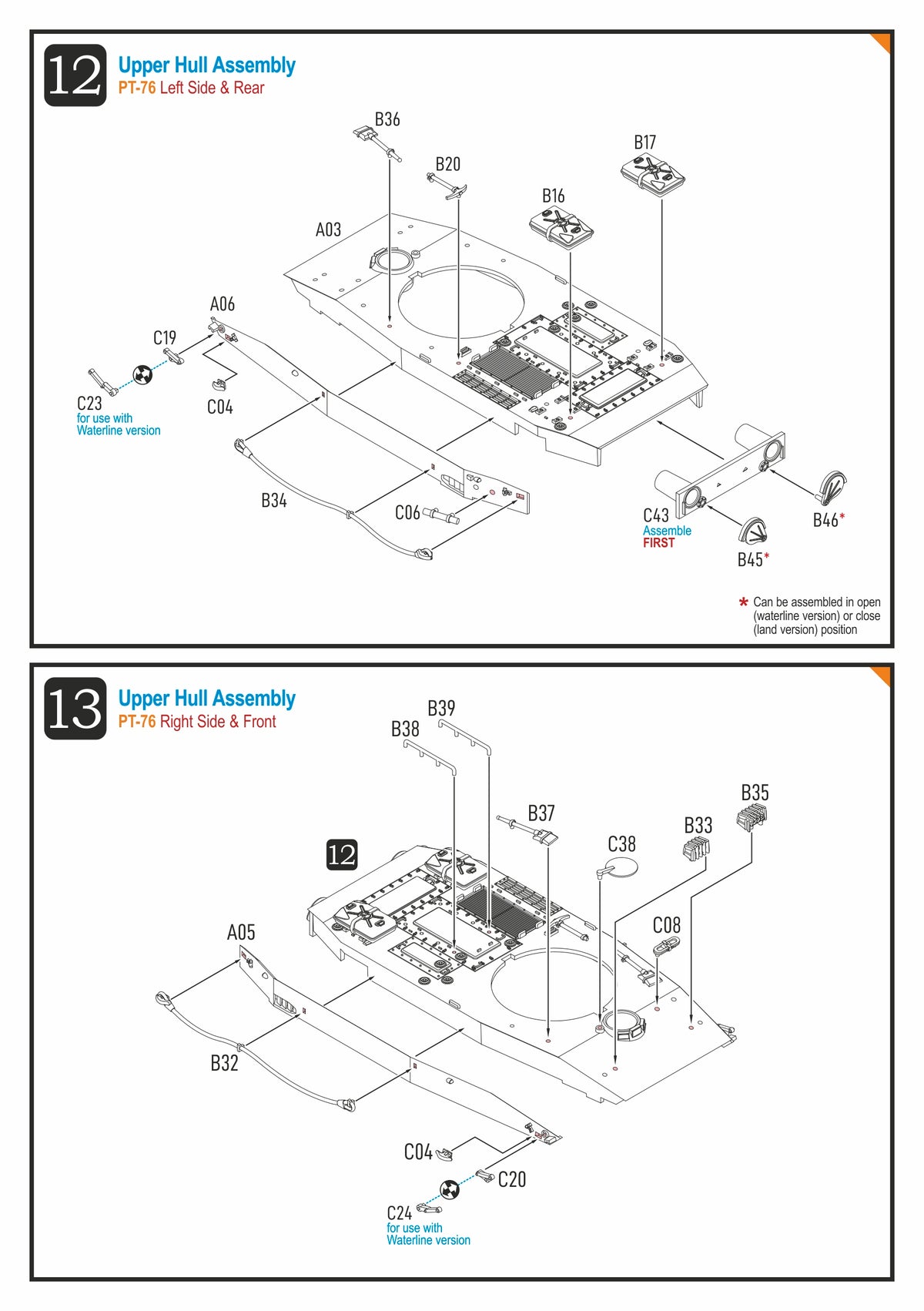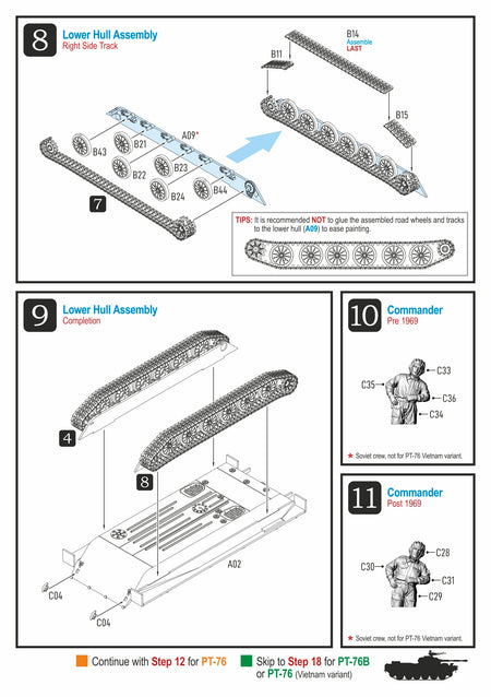 The PT-76 is a Soviet amphibious light tank that was introduced in the early 1950s and soon became the standard reconnaissance tank of the Soviet Army and the other Warsaw Pact armed forces. It was used in the reconnaissance and fire-support roles, and was widely exported. With this kit you can build either the PT-76 or PT-76B, and it comes with muzzle brake & trim board choices and optional DShK 1938 HMG and crew.