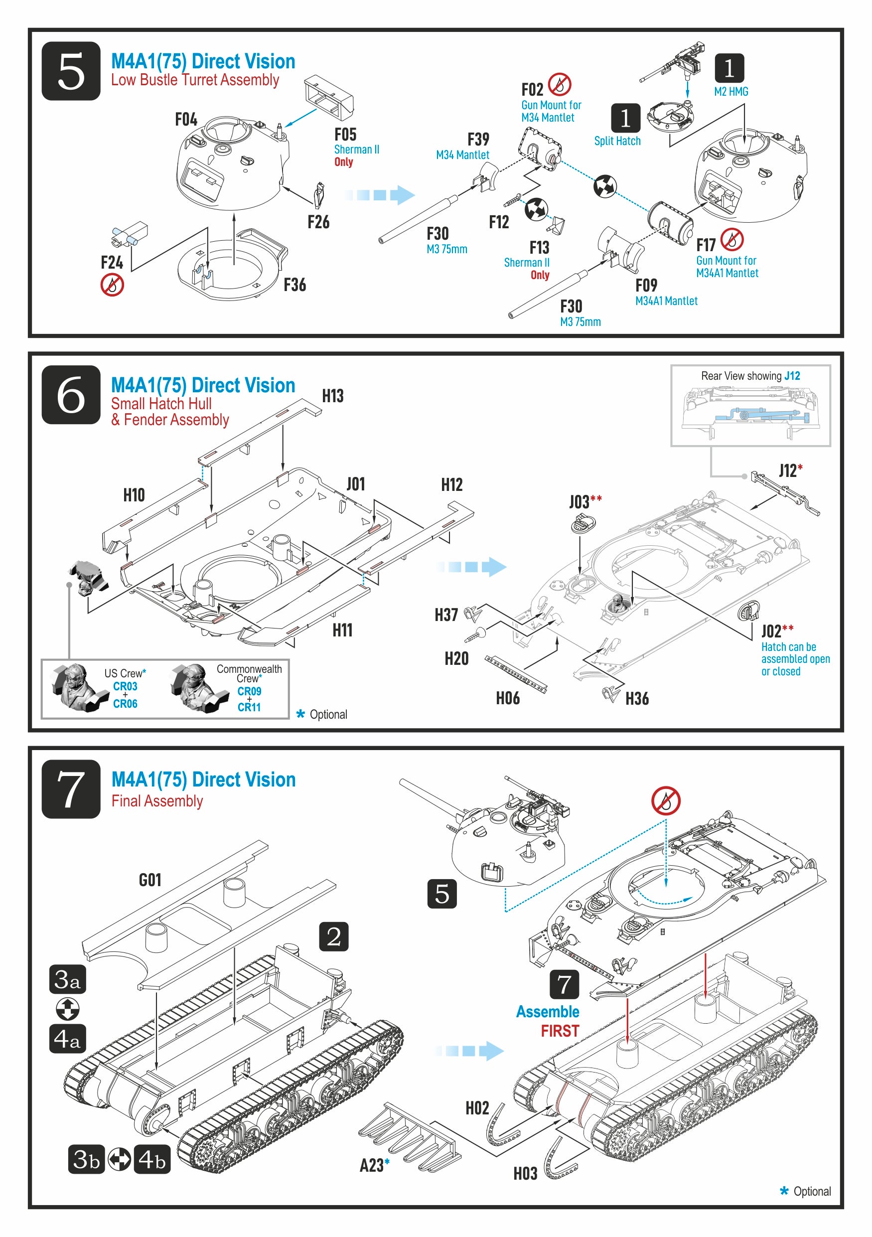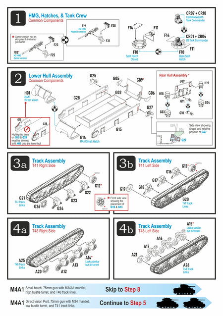 There are four M4A1 variants. The M4A1(75) Sherman (Sherman II in the British naming system) with a 75mm gun (6,181 units); the M4A1(75) Sherman with large hatches (100 units); the M4A1(76)W Sherman (Sherman IIA) with “wet” ammunition stowage (2,171 units); and the M4A1(76)W HVSS Sherman (Sherman IIAY) with HVSS suspension (1,255 units).
